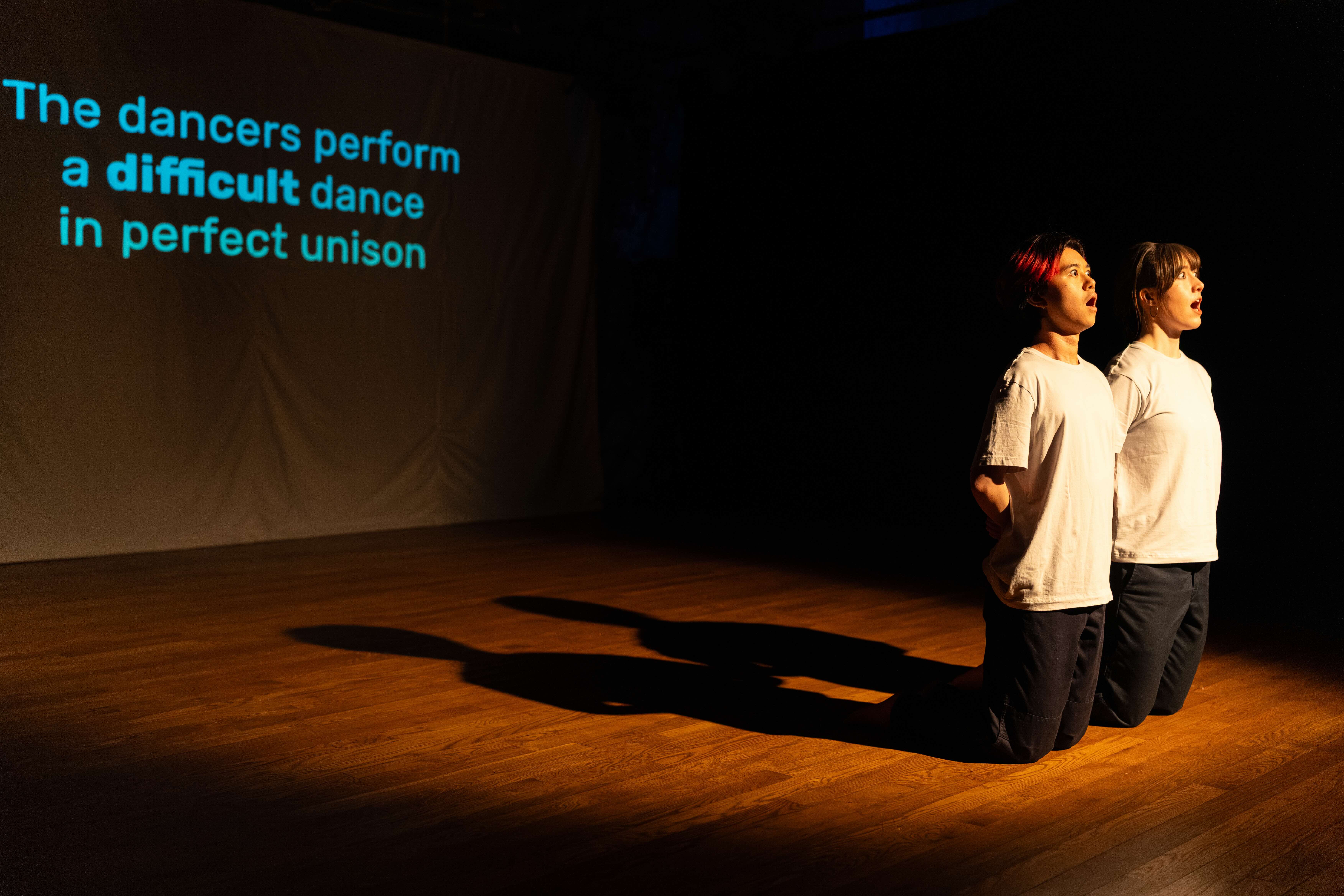 A radio broadcast on the history of the computer crackles over a tinny dance beat. Enter two dancers (Miranda Brown and Noa Rui-Piin Weiss). A command appears on the upstage wall: “The dancers dance.” They do, then return their gazes to the wall, where the command is replaced with words of praise. As they shift their bodies around the bare floor they receive another command: “The dancers need to train more before they keep dancing.” Brown and Weiss discuss their options then, palm-to-palm, do push-ups against each other, bestowing a tender forehead kiss each time they come together. Next command: “The dancers perform a difficult dance in perfect unison.” We hear the discipline, the ruthless precision, of a metronome. The text refreshes: “…a *difficult* task…” The computer is dissatisfied. Once more with feeling.