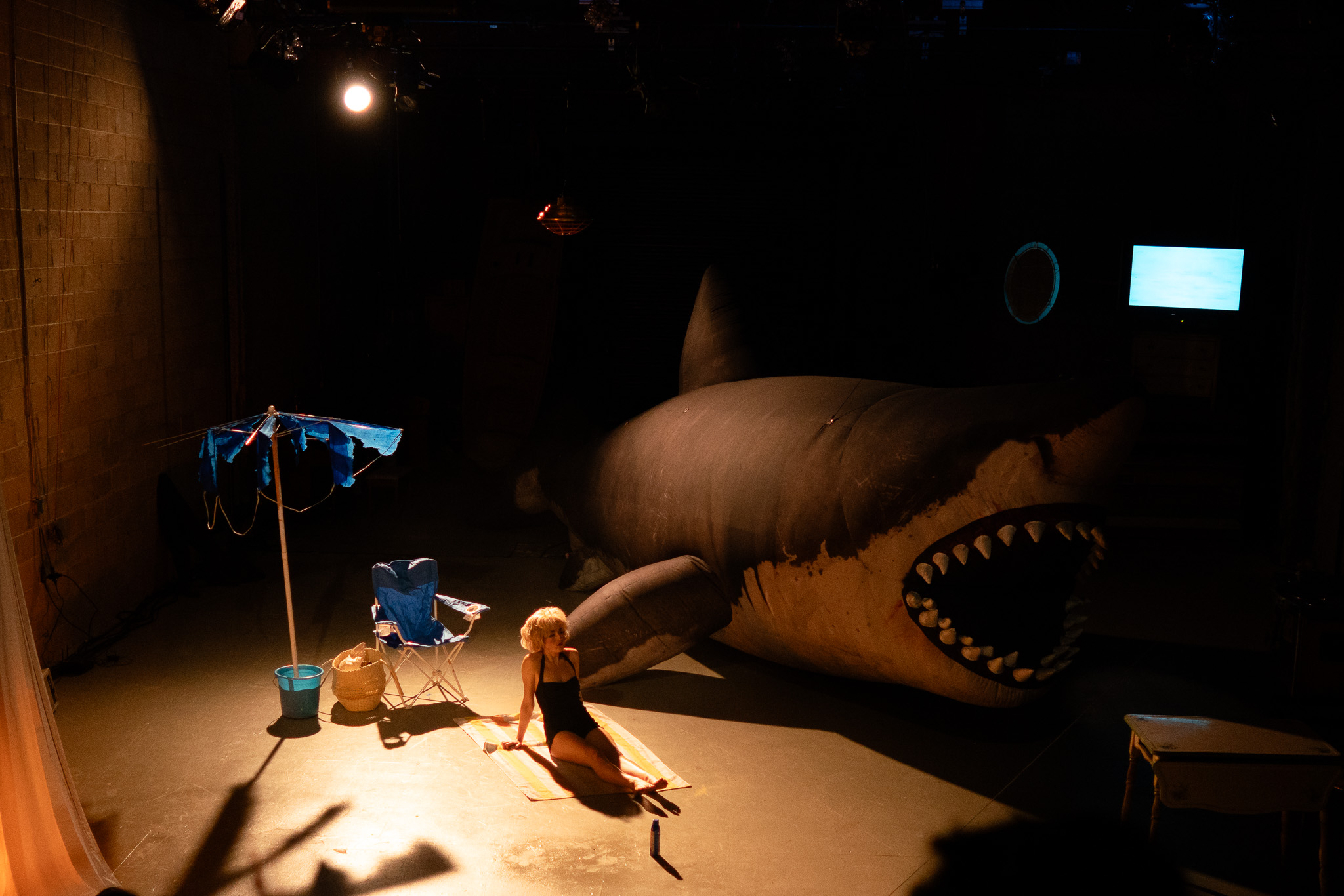 That there is a profound affinity between Ellen Brody and Woolf’s chapter is a foundational assumption of Time Passes (for Ellen Brody). The piece opens in darkness. A white ghost of light flits across the stage, then grows in intensity until one feels completely at sea, repeatedly caught and released by the beam of a lighthouse (lights by Abigail Sage). A spotlight flicks on and reveals performer Chloe Claudel, costumed in a Brody-esque 70’s-going-on-’50s-style house dress and blonde perm (costumes by Olivia Vaughn Hern) and perched atop a ladder reaching nearly to the warehouse ceiling. Claudel begins to recite “Time Passes” from the beginning with shrewd narratorial authority: “…‘It's almost too dark to see,’ said Andrew, coming up from the beach.” Claudel climbs down the ladder and gets busy in a tiny retro kitchen (spectacular spare set by Forest Entsminger) as a pile of grey nylon centerstage slowly and silently inflates into a massive, thirty-foot-long, ten-foot-tall Great White Shark. (The miniature plush shark and life-sized shark head hanging from the grid were evidently red herrings).