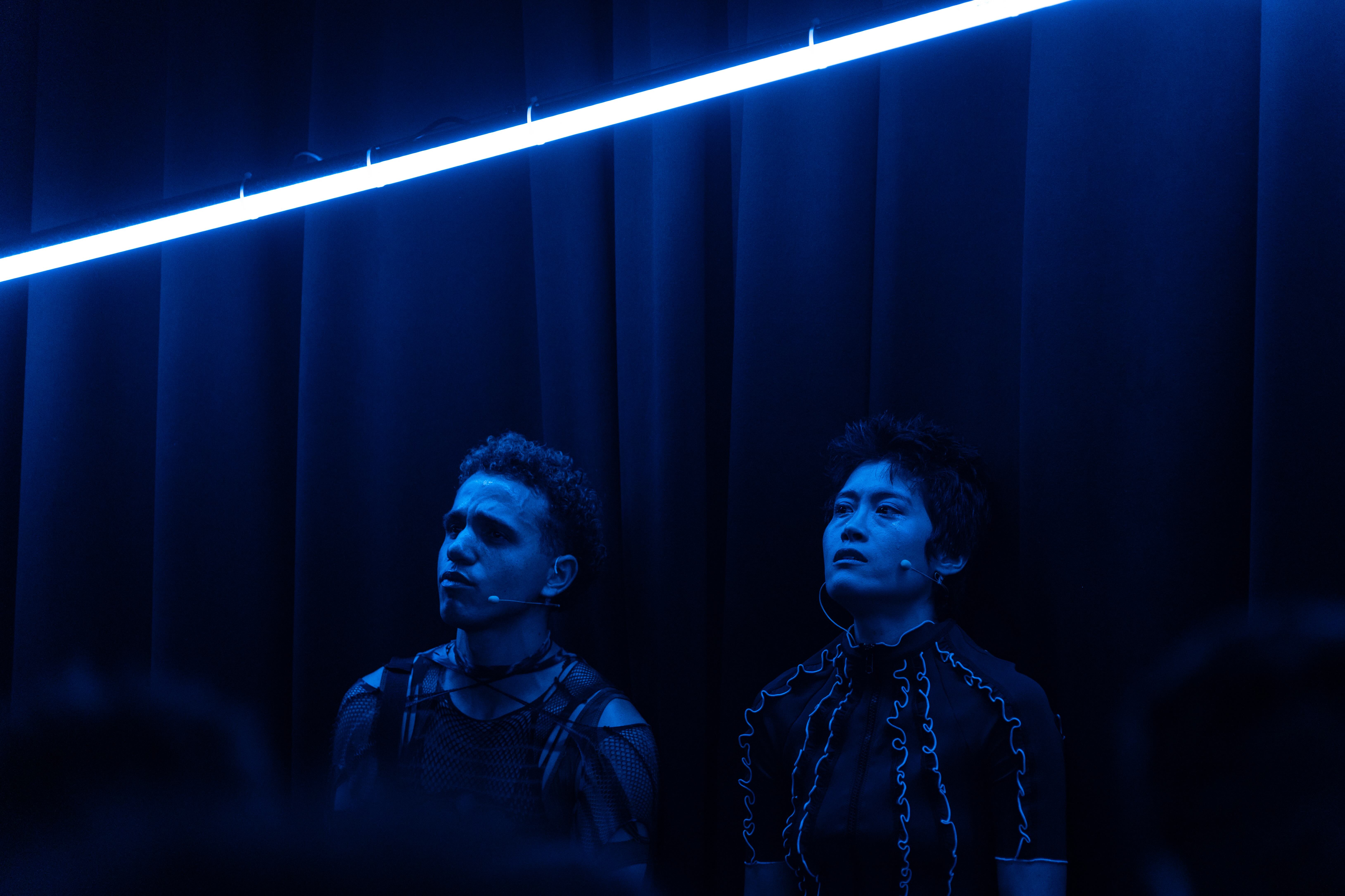The abstract piece I want to hold onto something beautiful and empty, written and directed by Hillary Gao, elicited these abstract thoughts. Gao’s play centers one nameless Office Siren, spliced into four actors (Nikkie Samreth, Miranda Kang, Sam Xu, and Ring Yang). The Office Siren(s) move through an ASMR-laden fever dream, jumping from the tennis courts on the 333rd floor, to the SHEIN offices on the eighteenth floor, to the Atlantic Ocean floor—nature’s basement—plus the Hunger Games arena, and Qing Dynasty China (approximately—I want to hold… is actually referencing a popular Chinese historical drama set in that time period). All this teleportation is actualized through dialogue, lighting, and the occasional movement of three cubicle-core set pieces. A sleek-looking psychopomp called Stage (Isabel Ebeid) serves as a voyeur to Office Siren’s roving, while three specteres haunt her: her grandmother, her physical appearance, and her email inbox.